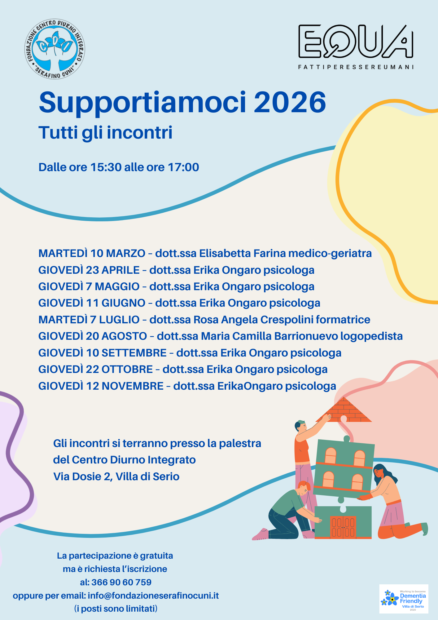 Gli incontri si terranno presso la palestra del Centro Diurno Integrato Via Dosé 2, Villa di Serio.