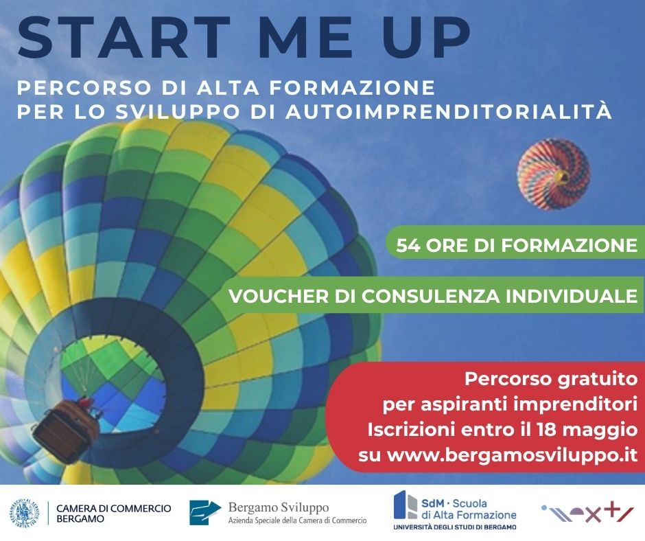 Bergamo Sviluppo, grazie al finanziamento della Camera di Commercio, organizza la nuova edizione di START ME UP – Percorso di Alta Formazione per lo sviluppo di autoimprenditorialità. L’iniziativa, realizzata con il supporto dell’Università di Bergamo e di Innexta, si rivolge agli aspiranti imprenditori che desiderano sviluppare la propria attitudine imprenditoriale e le competenze necessarie per la progettazione e il lancio di una startup.
